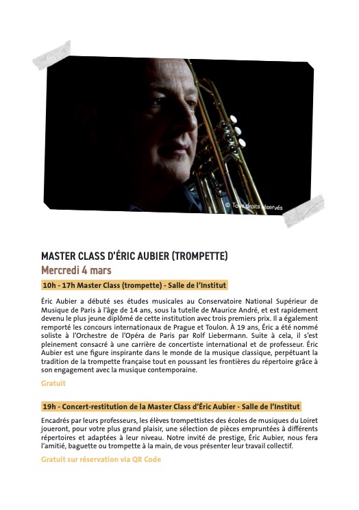 - Mercredi 4 mars – 10h : master class de trompette par Eric AUBIER suivi d’un concert de restitution (19h)