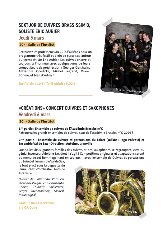 - Vendredi 6 mars – 20h : « créations » concert cuivres et saxophone