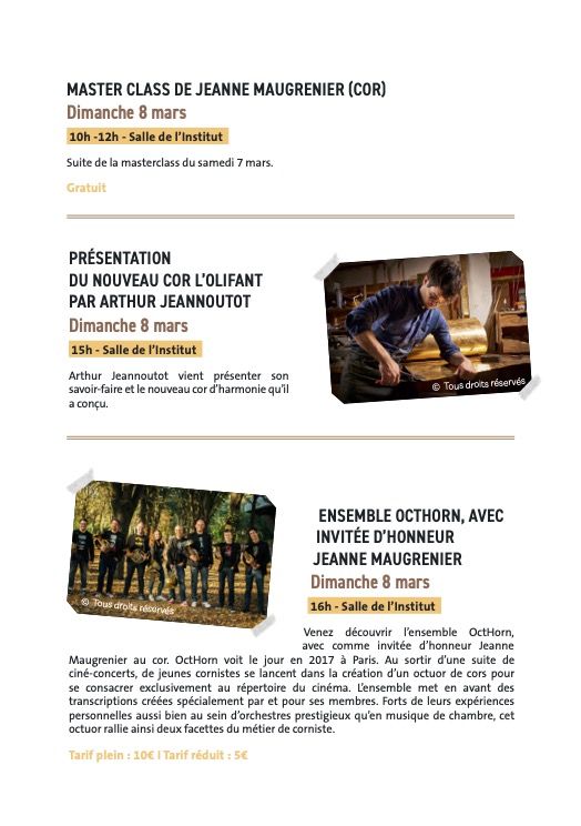 - Dimanche 8 mars – 10h : master class de cor par Jeanne MAUGRENIER
